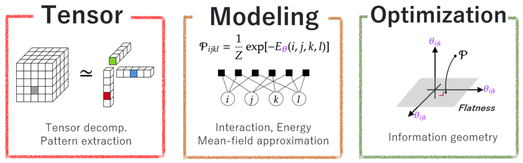 However, a naïve bridging between physics and machine learning often introduces additional complexities. To address this issue, I employ information geometry, which provides the concept of flatness within models and data. This flatness gives us insight to reformulate the target problems into convex optimizations, preserving mathematical tractability while enabling a systematic formulation informed by physics-grounded intuition. As seen below, I have demonstrated these ideas in tensor factorization and tempered Expectation Maximization (EM) algorithm, and will further enhance their expressivity via advanced concepts from non‑equilibrium statistical mechanics.